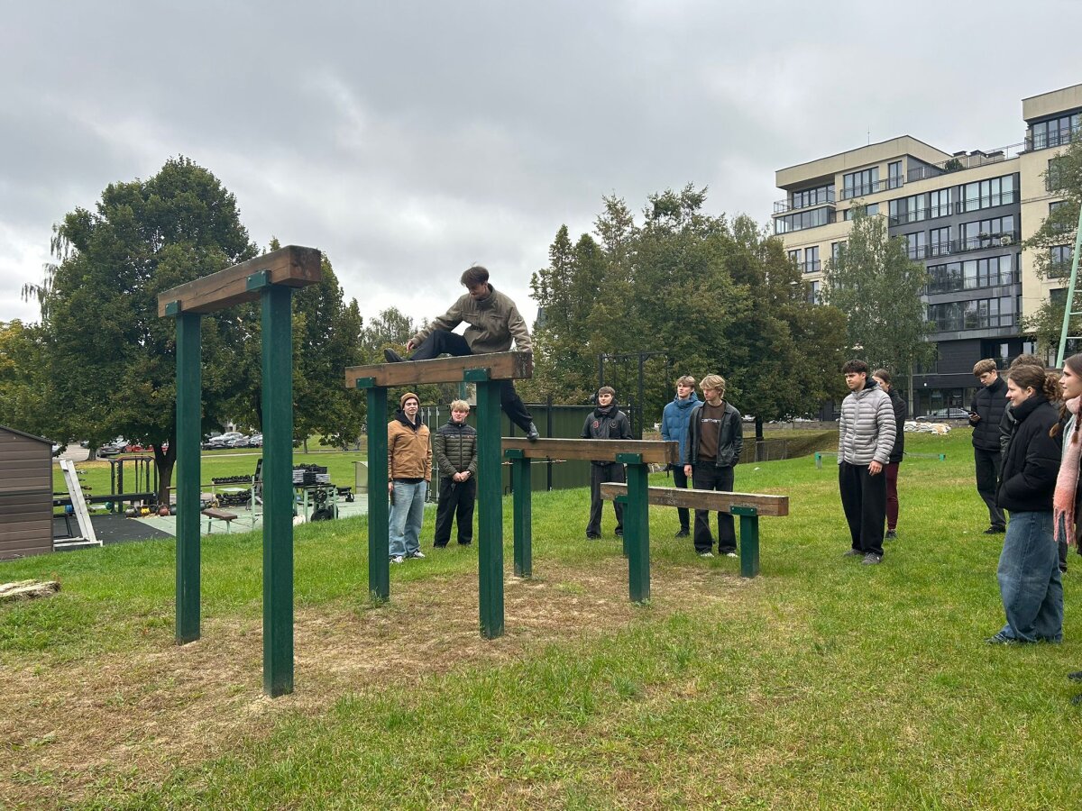 Lauke mūsų laukė kliūčių ruožas – kopimas per sieną, lipimas virve. Drąsuolių išbandyti jėgas