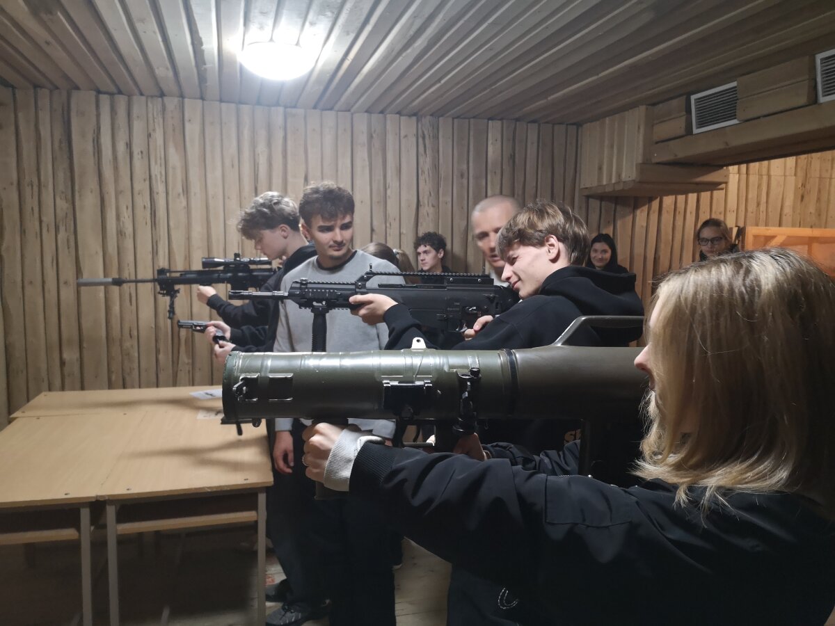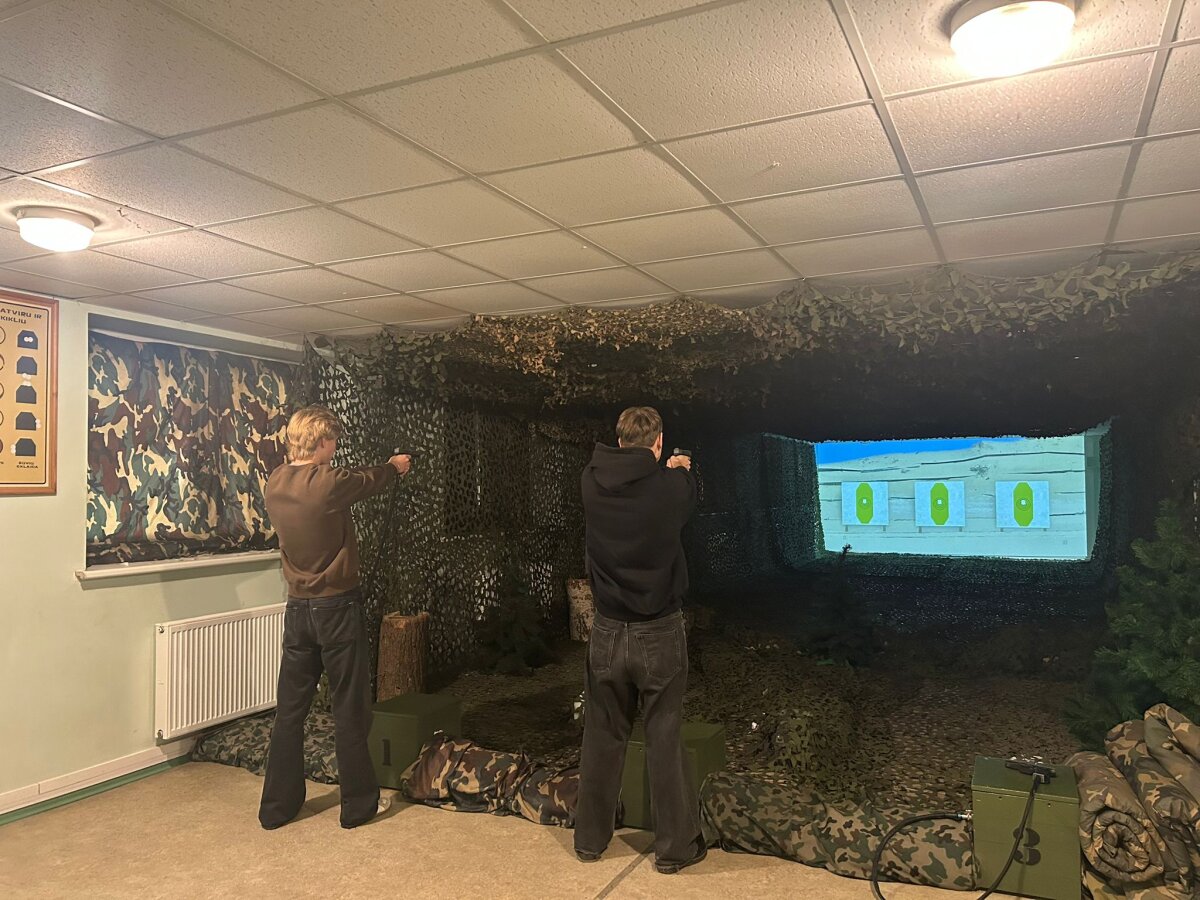 Vėliau išbandėme šaudymą pistoletu specialioje lazerinėje treniruočių erdvėje, kur šaudoma į