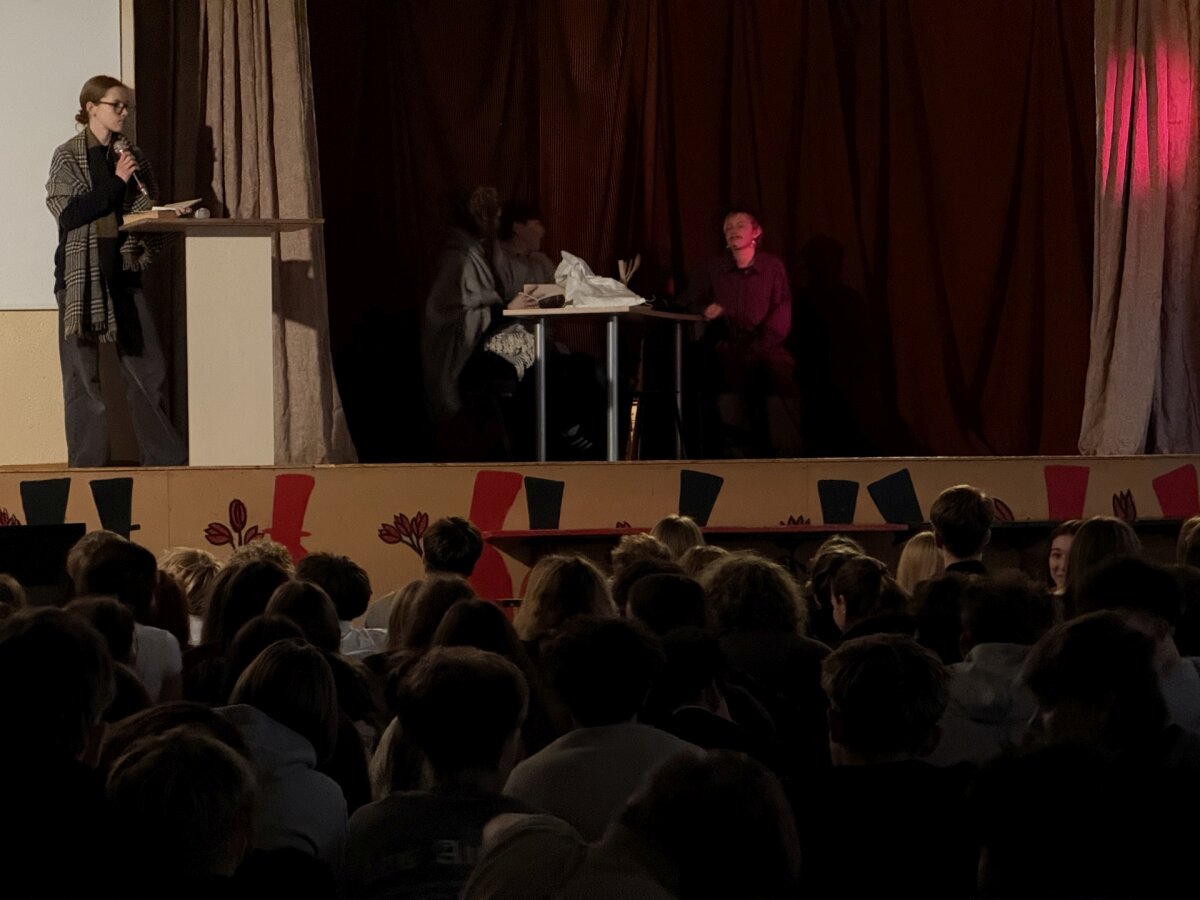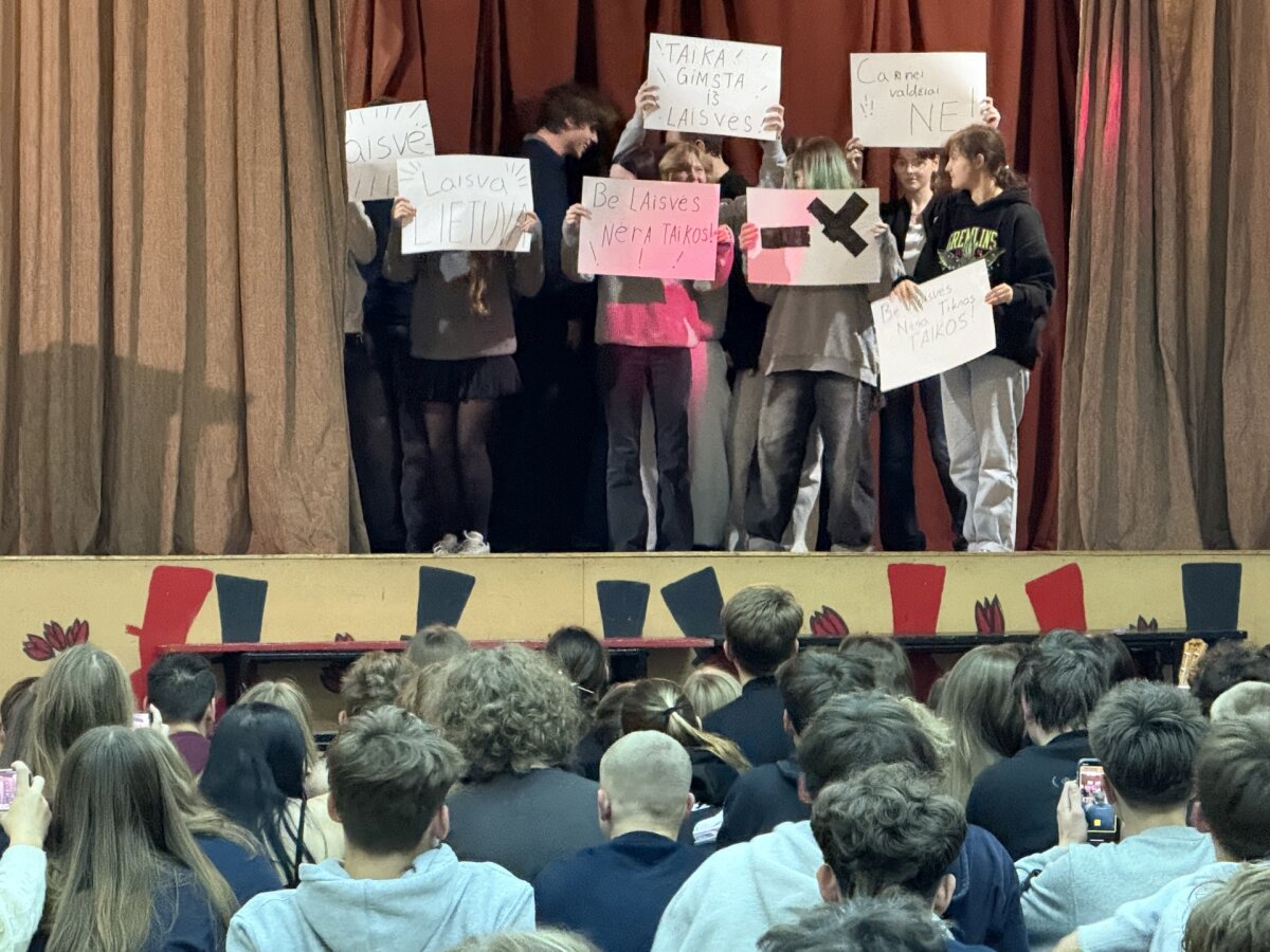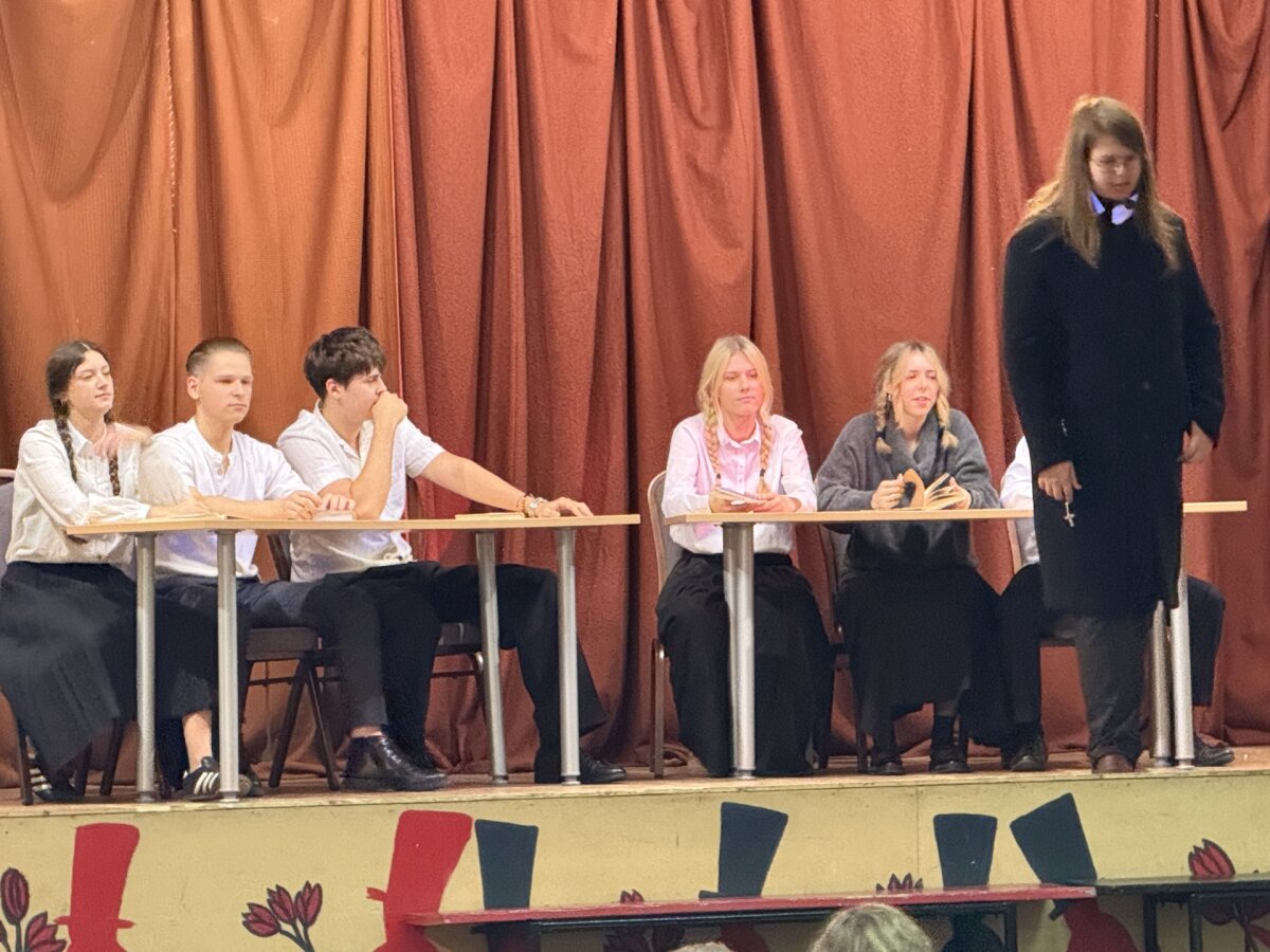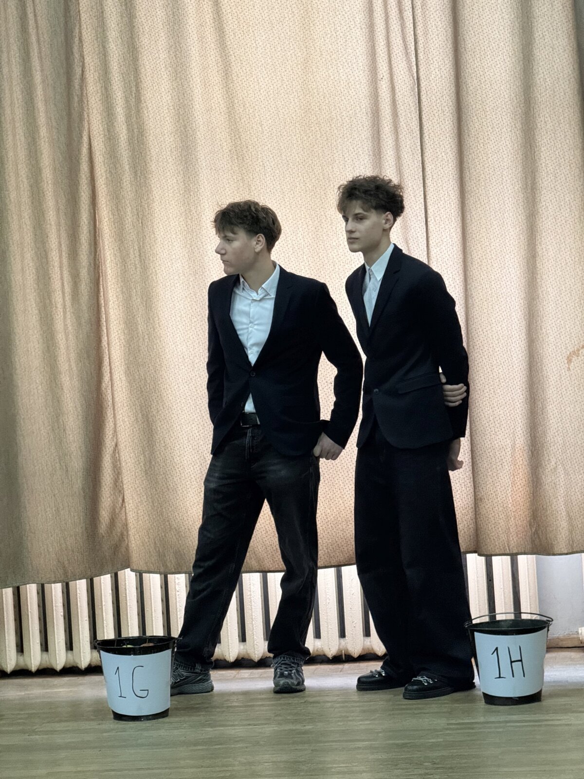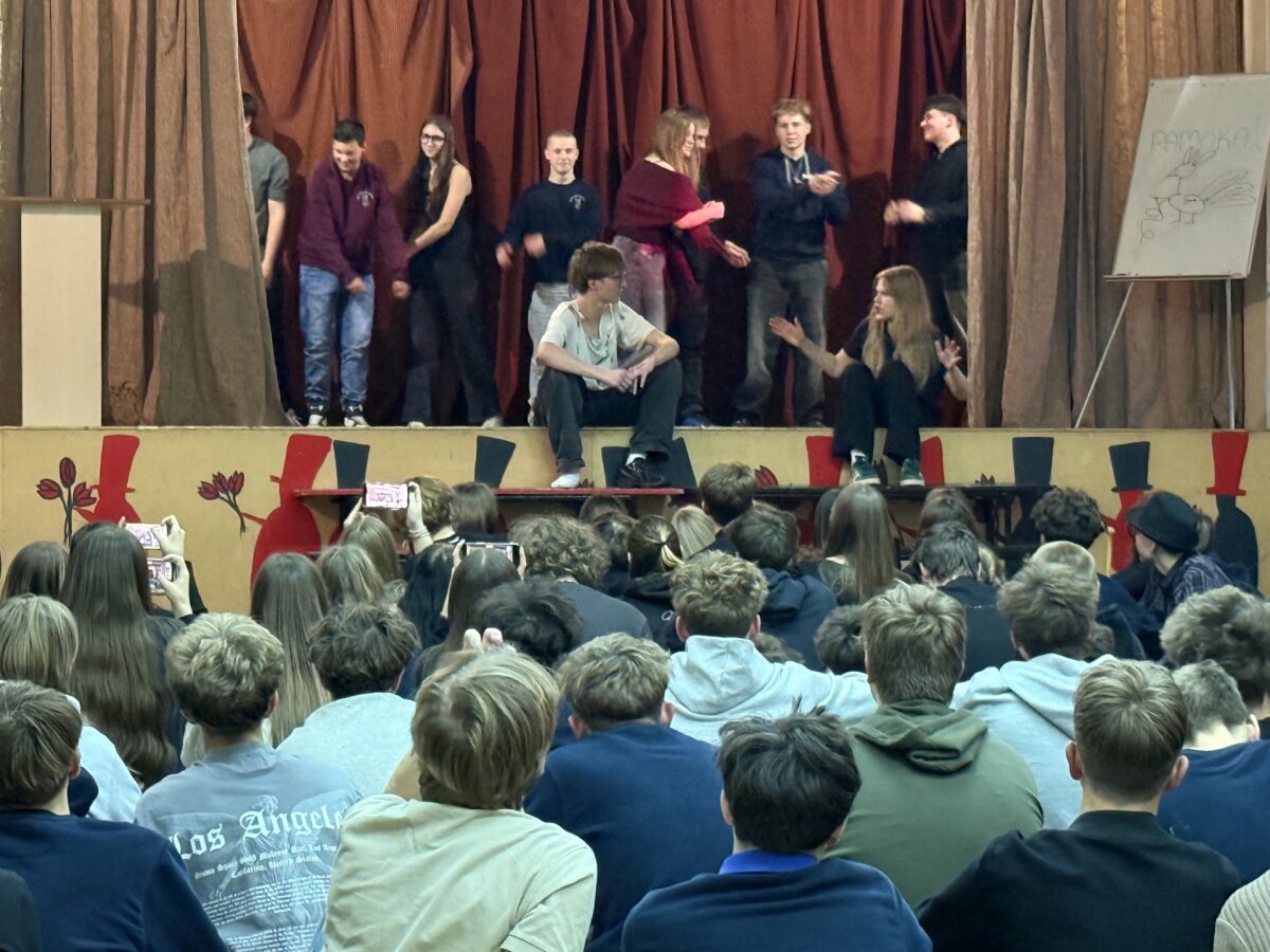 Tuomet prasidėjo „pamoka“ – 12-okai su šiuolaikišku humoru pavaizdavo lietuvių kalbos pamoką, kurioje mokytojas nesuvaldė triukšmingų mokinių ir galiausiai iškvietė „kunigą“. Šis „kunigas“ pakvietė kiekvieną 9-okų klasę pristatyti savo pasirodymą tema: „Baudžiavos panaikinimas“, „Dėdės ir dėdienės“, ar „Donelaičio metai“ ir kiti.