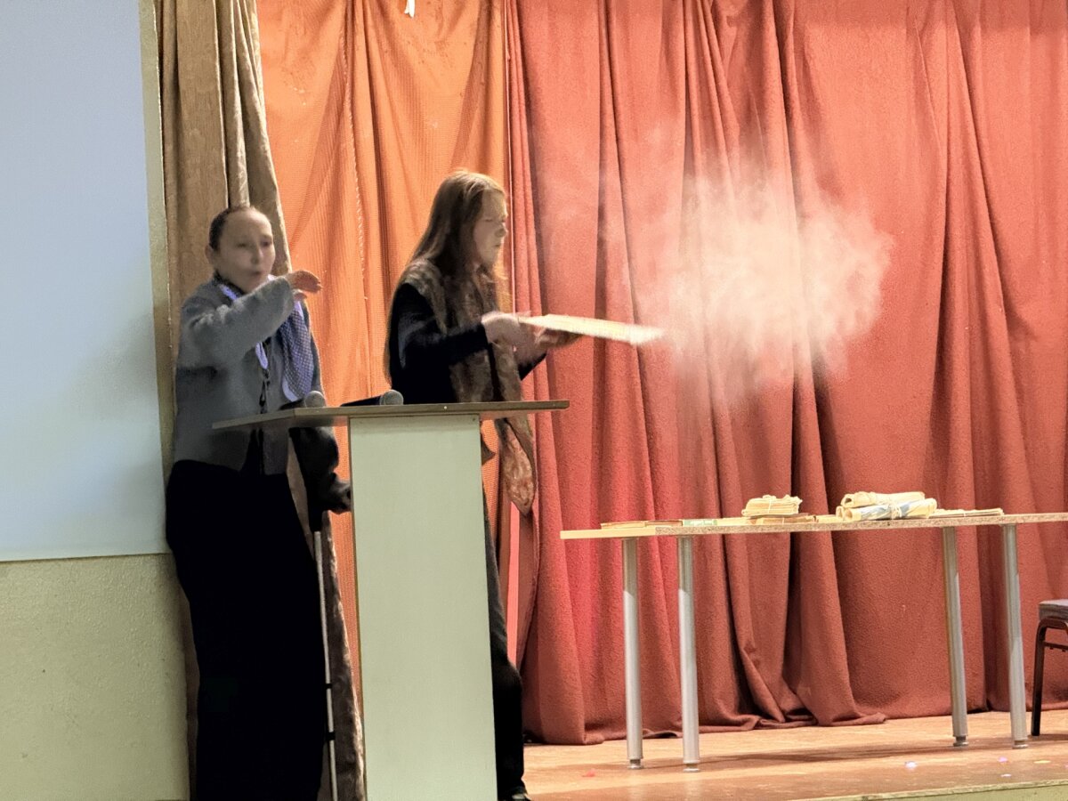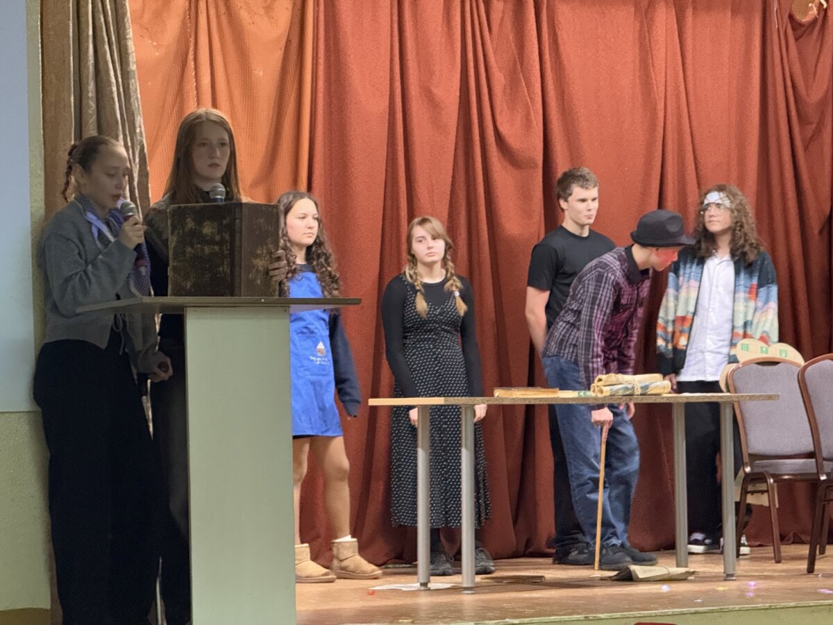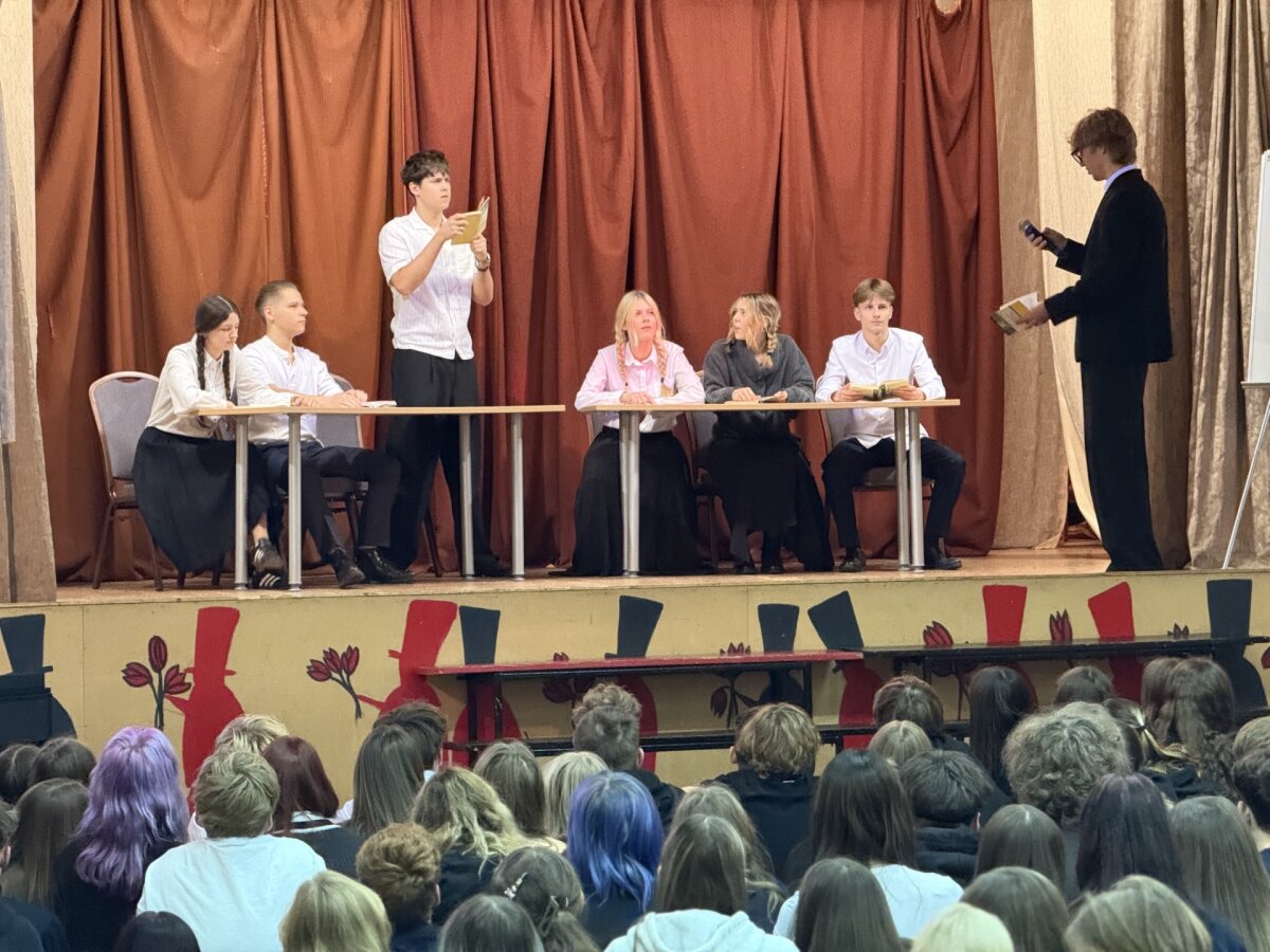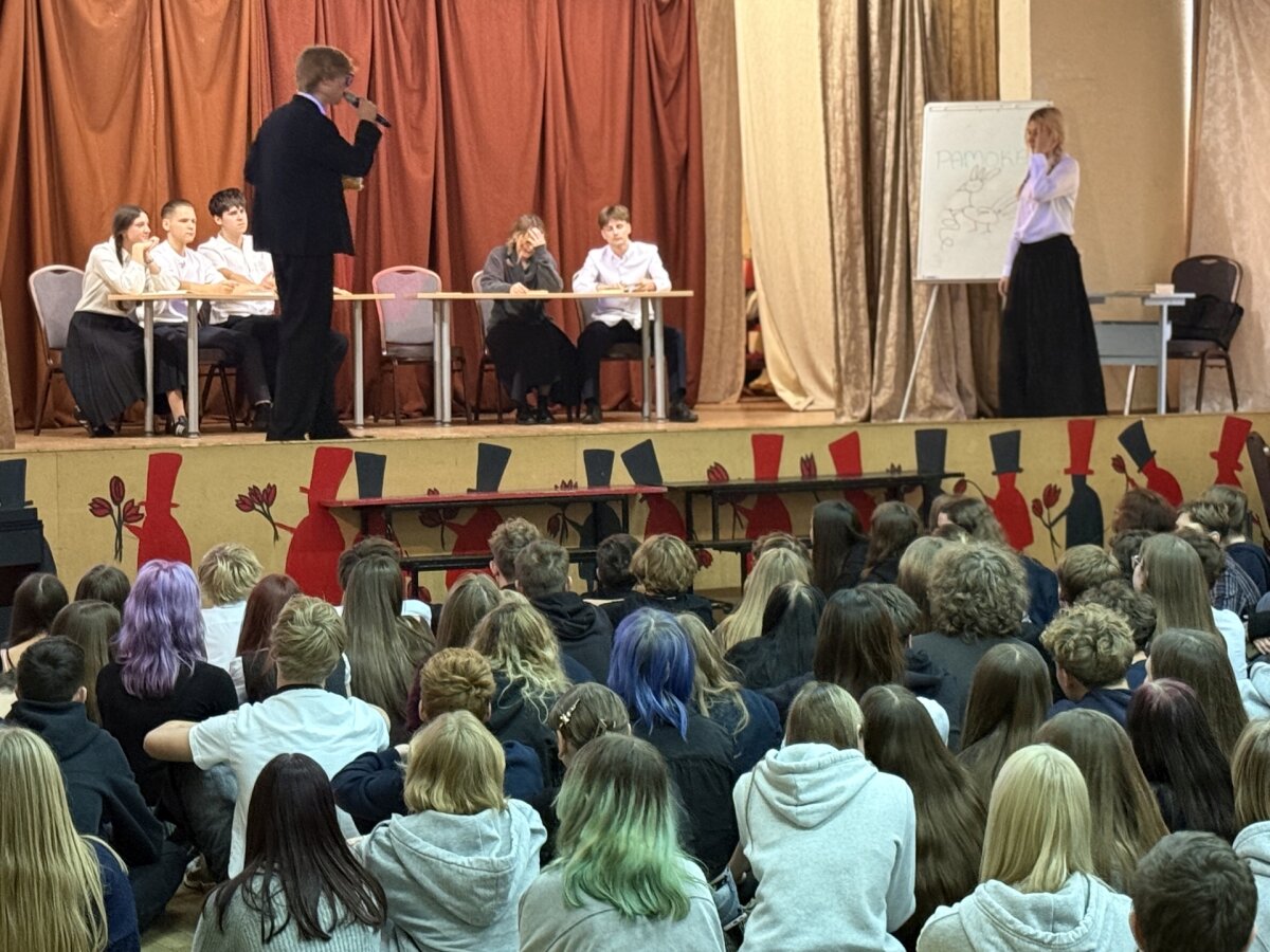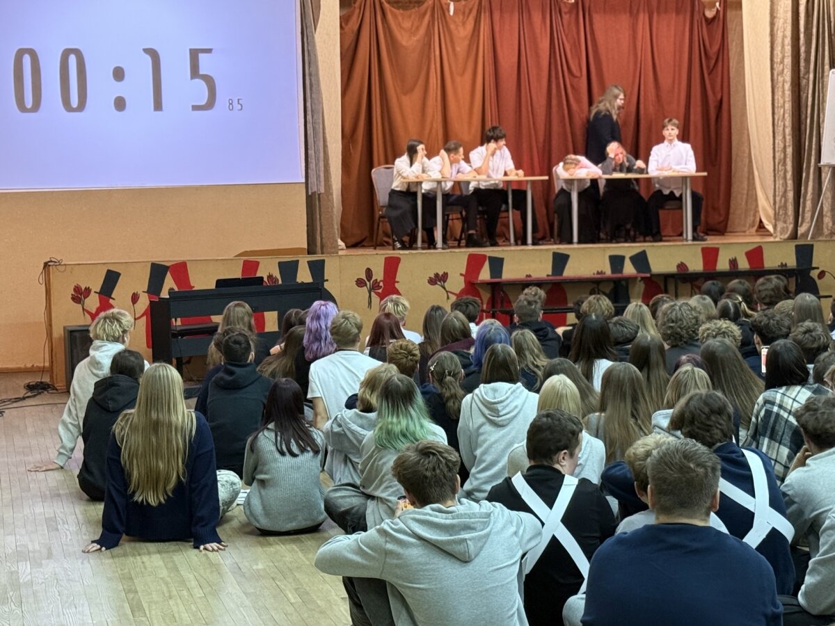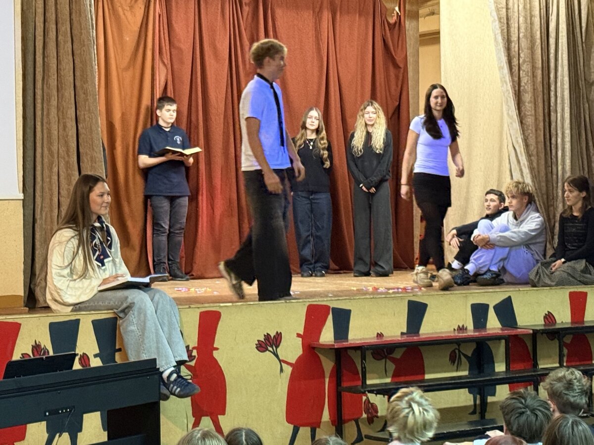 Tuomet prasidėjo „pamoka“ – 12-okai su šiuolaikišku humoru pavaizdavo lietuvių kalbos pamoką, kurioje mokytojas nesuvaldė triukšmingų mokinių ir galiausiai iškvietė „kunigą“. Šis „kunigas“ pakvietė kiekvieną 9-okų klasę pristatyti savo pasirodymą tema: „Baudžiavos panaikinimas“, „Dėdės ir dėdienės“, ar „Donelaičio metai“ ir kiti.