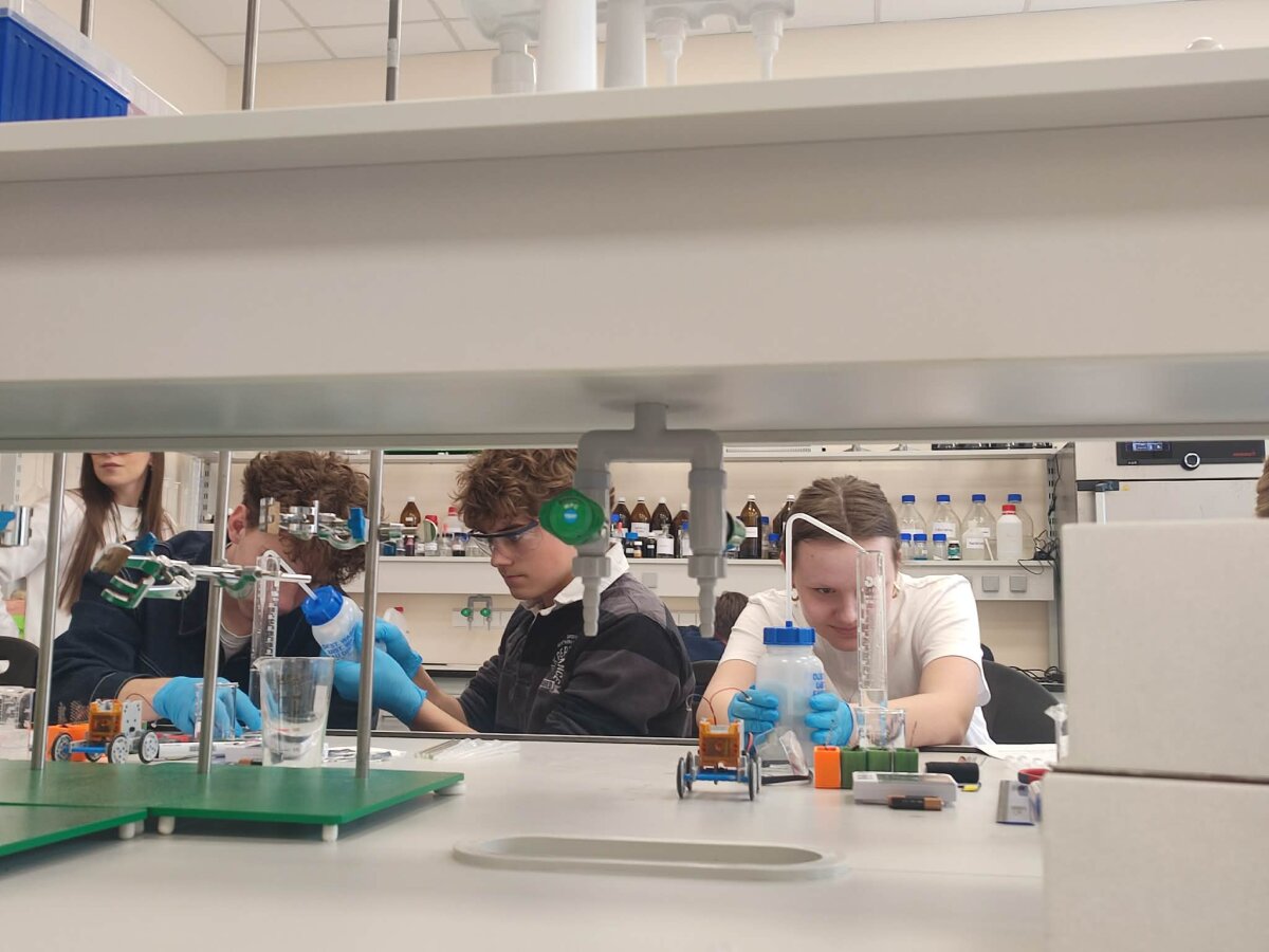 STEAM veiklos „Kaip sukurti bateriją?“ metu mokiniai pritaikė chemijos ir fizikos žinias konstruodami energijos šaltinius. Jie paruošė keturių skirtingų elektrolitų tirpalus, pagamino anodus bei membranas ir sukonstravo keturias veikiančias baterijas. Didžiausio susidomėjimo sulaukė praktinis išbandymas – mokiniai prijungė savo sukurtas baterijas prie mašinėlių ir surengė lenktynes. Taip jie eksperimentuodami nustatė, kuris elektrolitas veikia efektyviausiai. Ši veikla leido praktiškai susipažinti su galvaninio elemento veikimu ir elektros energijos gamyba.